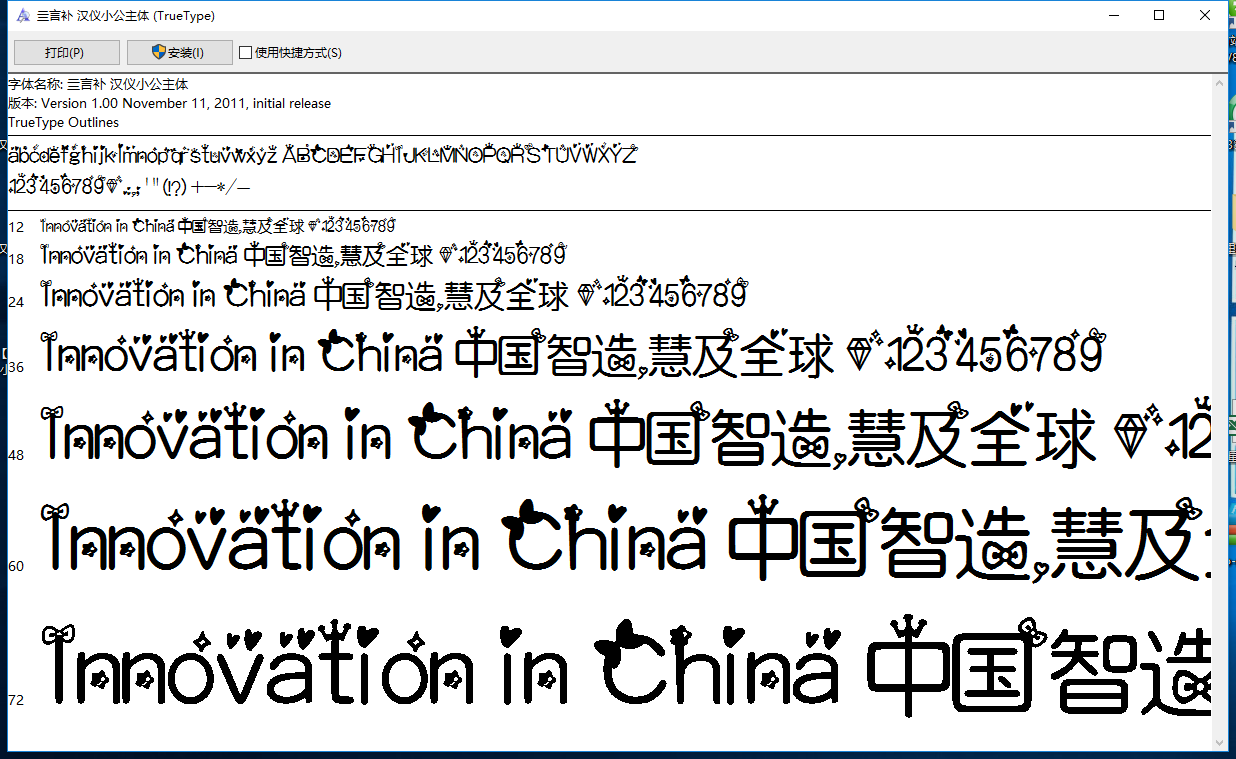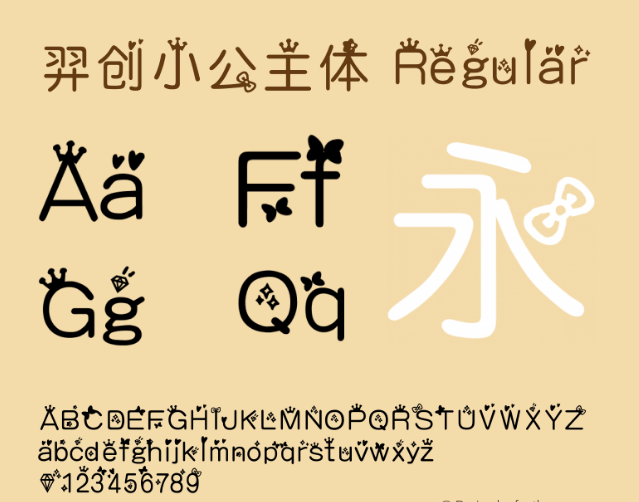 【亖言】汉仪小公主体手机中文字体下载。这款字体是以圆体字体为原形,字体间加入了卡通图案装饰。在具备圆体字体清晰端正风格的同时,也增添了趣味性,是一款非常可爱的卡通字体,适合喜欢卡通的朋友下载哦。