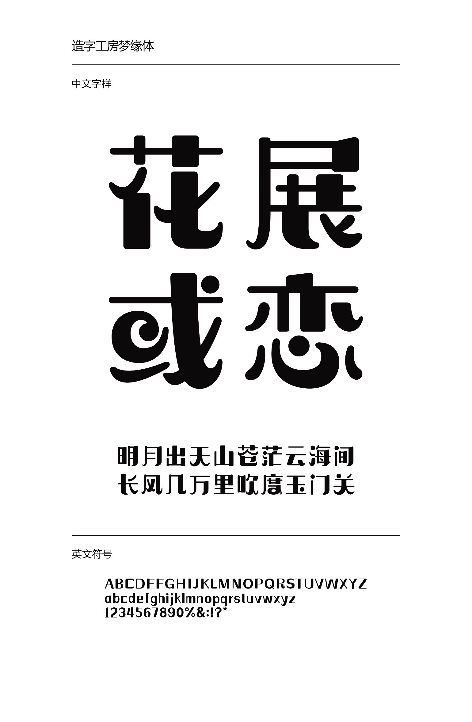造字工房梦缘体,字体个性鲜明,笔画粗细对比强烈,个别点画变形为圆形,撇、捺的处理跳脱流畅,极富动感。字形风格兼具民国风韵,婉约俏皮又不失摩登感。适用于大标题及个性品牌设计推广等环境。本字体为简体字库,采用OpenType/CID格式,Adobe-GB1-5编码。基于中华人民共和国GB2312-80字符集标准,另按需添加101个汉字。共收容字数6864CJK汉字,ASCII常用字符100个。