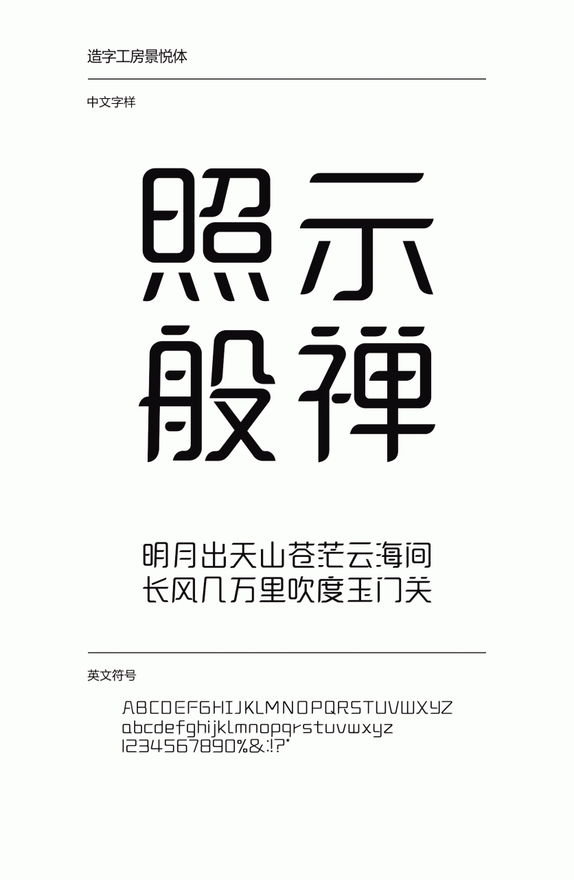造字工房景悦体,结构端正,字形饱满、匀称,笔画转折间巧用圆角,使得整套字体圆润舒展,字形整体风格端秀清新,婉转有度。适用于大标题及个性品牌设计推广等环境。本字体为简体字库,采用OpenType/CID格式,Adobe-GB1-5编码。基于中华人民共和国GB2312-80字符集标准,另按需添加101个汉字。共收容字数6864CJK汉字,ASCII常用字符100个。