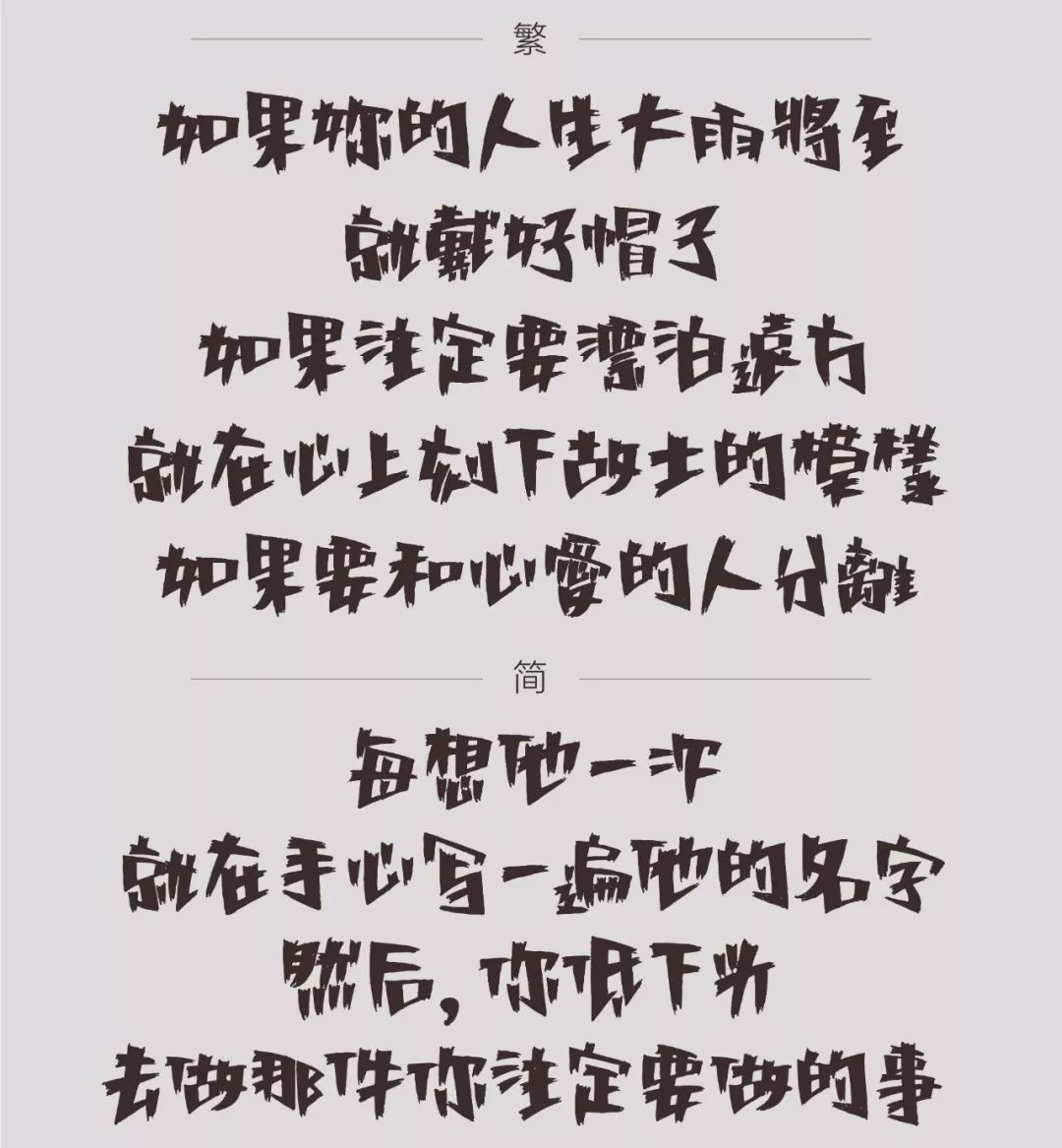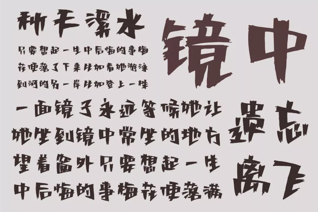 方正法小珂体,从字形来看并不规矩,如同长歪了的树,每个字都打破传统字形规范,重心右倾,左右上下各部分大小比例鲜明,却生出自有的平衡体系和风格,兼具笨拙 、直率、质朴、随性、懒散、童真,枯笔效果可能还带出一点飒。“任性的洒脱,克制的浪漫”,大概就是这样子吧。适用于独立,喜与众不同,文艺情怀爱好者,应用于标题,包装,海报,广告,文化印刷品及周边。