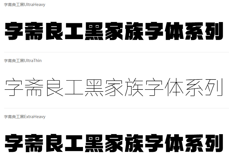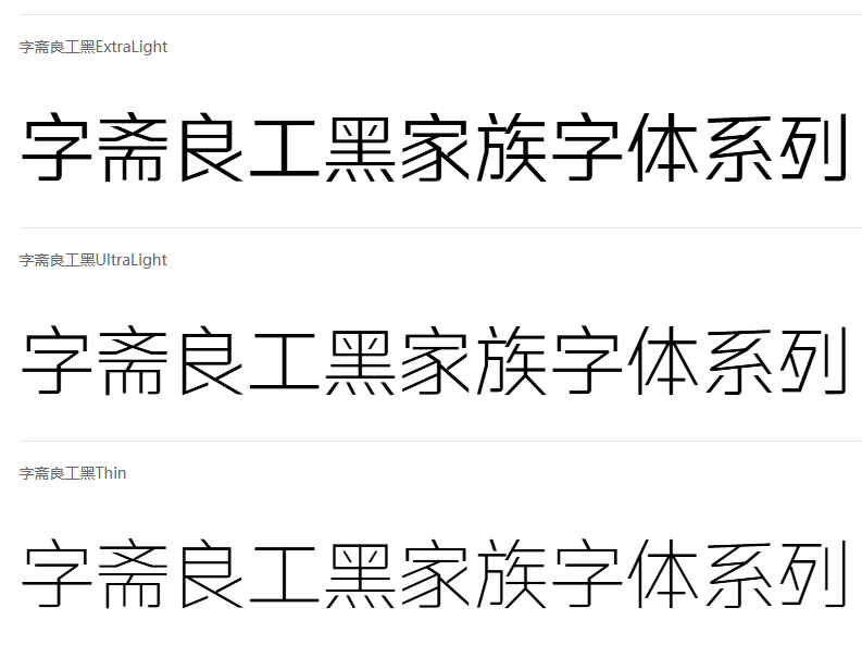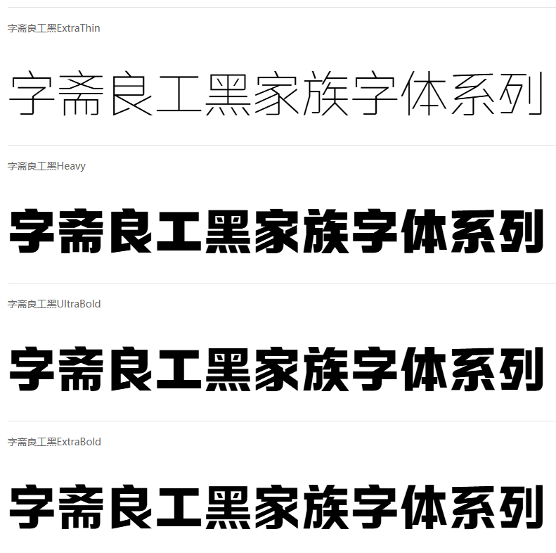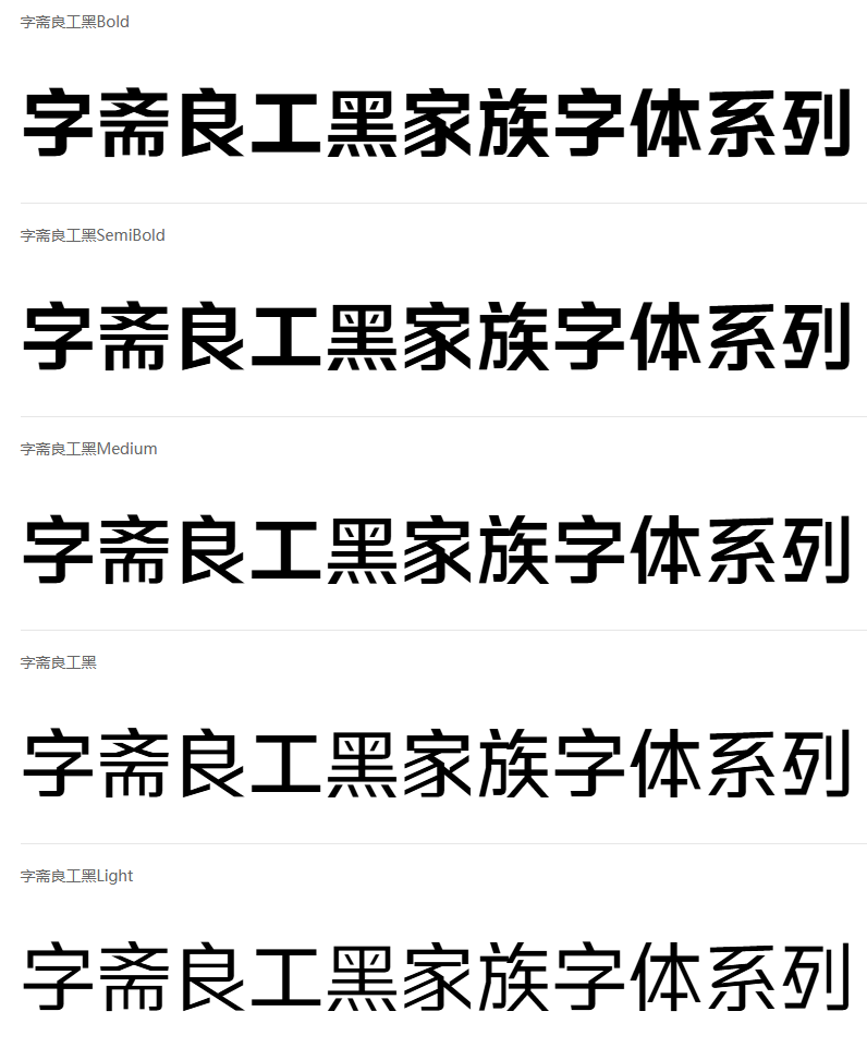 《字斋良工黑》家族,有细、准、中、粗、 超粗五个粗细类别,便于使用,每个粗细类别再次减细和加粗,全套家族字体共有15款之多,每款粗细包含简体国标汉字 7119 个,外文及符号 761 个。共计 7880 个字符。这款黑体系列粗细丰富,遵循传统汉字,结字规律,风格干净练达直接,粗细随,心自由切换。同时做了西文、日文与汉,字的统合,实现外文匹配用字视觉无障碍。部件的减省设计,整字显示清晰便于视觉传达,又与传统黑体拉开视觉差距。奉“天下标题,唯粗不破”的理念,将粗做到了超粗 +,粗的雄壮,粗的可爱。在彰显高级、时尚上,做到细 -,细的匀称,细的雅致。准、中、粗可以短文排版和做小标题使用。无论横排、竖排,方整匀称的块状感非常好用。是一款与众不同又很优秀的黑体家族字。